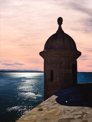 From a technical perspective, the photograph stands out for its handling of backlighting and the specular highlights on the sea. The dynamic range preserves subtle masonry details in the shadows, while the pastel-toned sky provides an ethereal backdrop that emphasizes the silhouette of the "Vigía." It is a work that invites contemplation and celebrates Puerto Rico’s historical heritage with a clean, modern aesthetic.