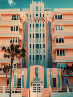This work is a visual immersion into the iconic aesthetic of Ocean Drive. It captures the essence of the Art Deco movement through a rigorous frontal composition that highlights the purity of vertical lines and architectural symmetries. The color palette—where vibrant salmon meets turquoise accents—evokes the tropical glamour and nostalgic energy of a city living under an eternal sun.