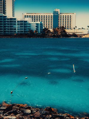 A work that documents the intersection between the Atlantic's untamable nature and the capital's architectural development. The composition is divided into marked horizontal planes, where the high-detail rocky foreground serves as a base for an electric burst of blues. The presence of the iconic Caribe Hilton on the horizon adds a layer of historical and tourist narrative, turning the landscape into a symbol of San Juan's modern identity.