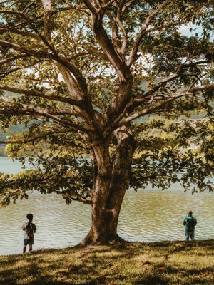 This work is an ode to patience and the silent connection between humanity and nature. The composition uses the imposing branched structure of a centuries-old tree as a natural frame that protects and envelops the fishermen on the shore, casting it as a timeless guardian of the landscape. The scene evokes a feeling of deep peace, where time seems to stand still under the shade, transforming a daily hobby into a moment of spiritual communion with the lakeside environment.