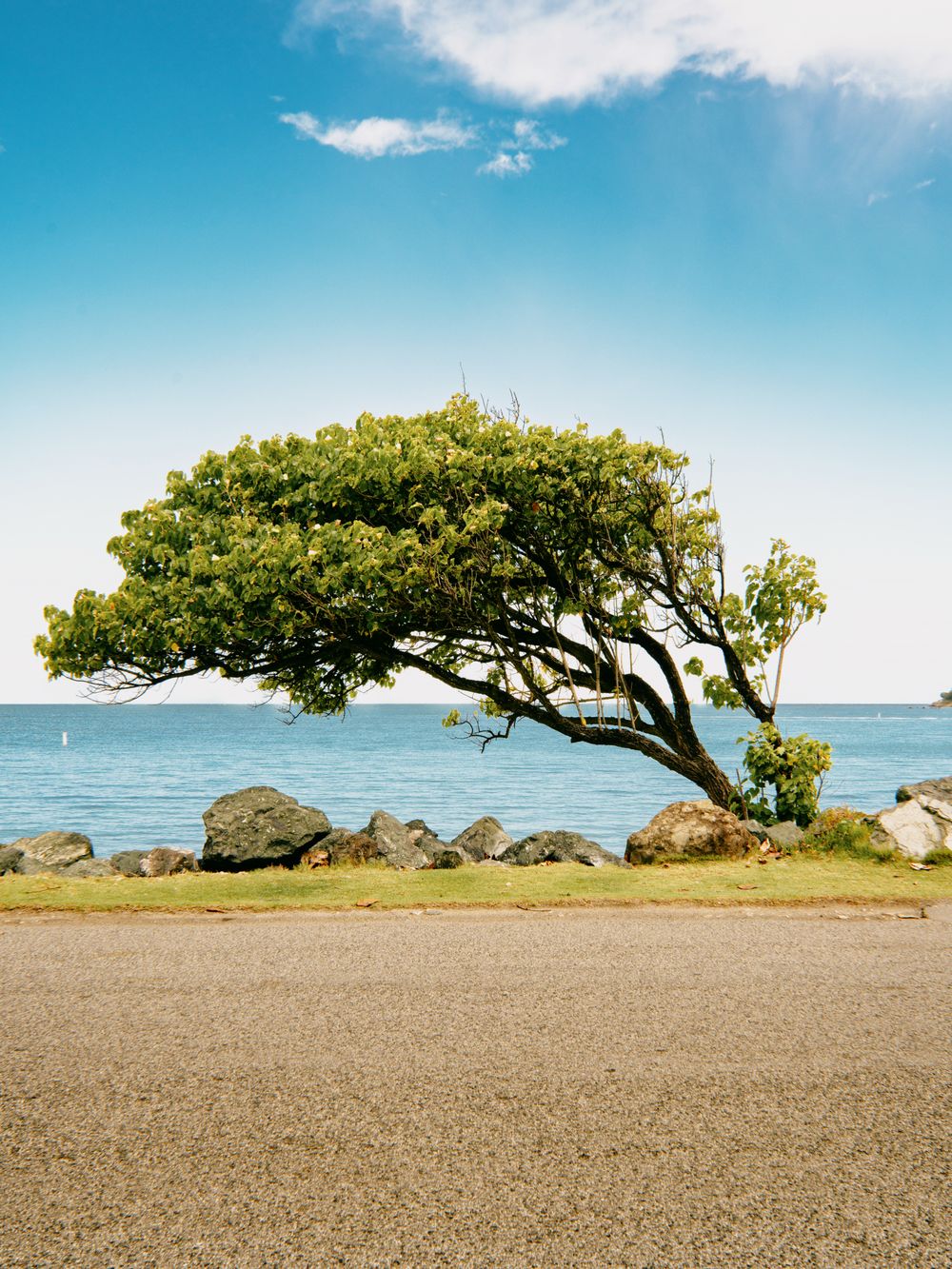 The photograph stands out for its impeccable horizontal plane structure, segmenting the image into layers of distinct textures: from the porosity of the asphalt in the foreground to the ethereal softness of the sky. The primary subject, the tree, breaks this linearity with an organic diagonal that adds dynamism and depth to the scene. There is a masterful use of color, where the saturated greens act as a visual anchor against the backdrop’s range of blues. The sharpness of the rocks and the bark adds a tactile realism that reinforces the solidity of the composition against the openness of the horizon.